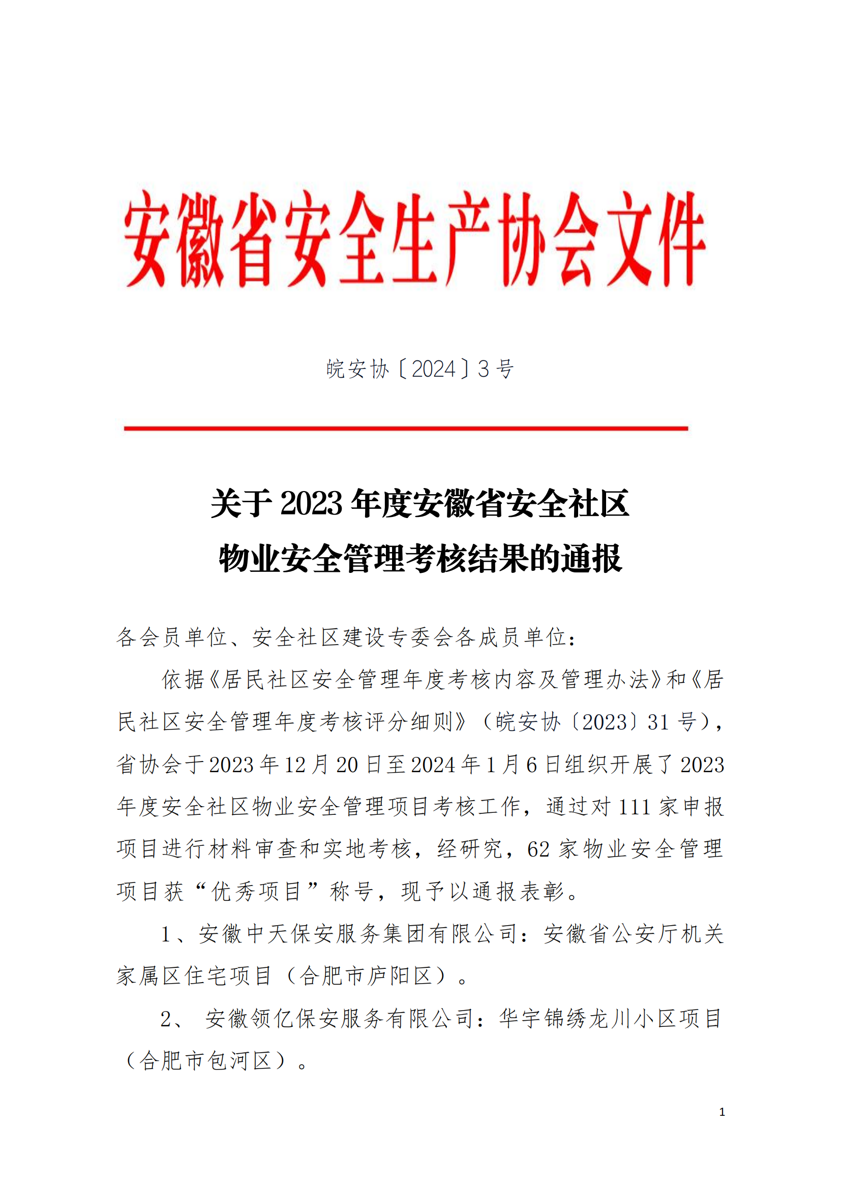 依据《居民社区安全管理年度考核内容及管理办法》和《居民社区安全管理年度考核评分细则》(皖安协〔2023〕31号),省协会于2023年12月20日至2024年1月6日组织开展了2023年度安全社区物业安全管理项目考核工作,通过对111家申报项目进行材料审查和实地考核,经研究,62家物业安全管理项目获“优秀项目”称号,现予以通报表彰。