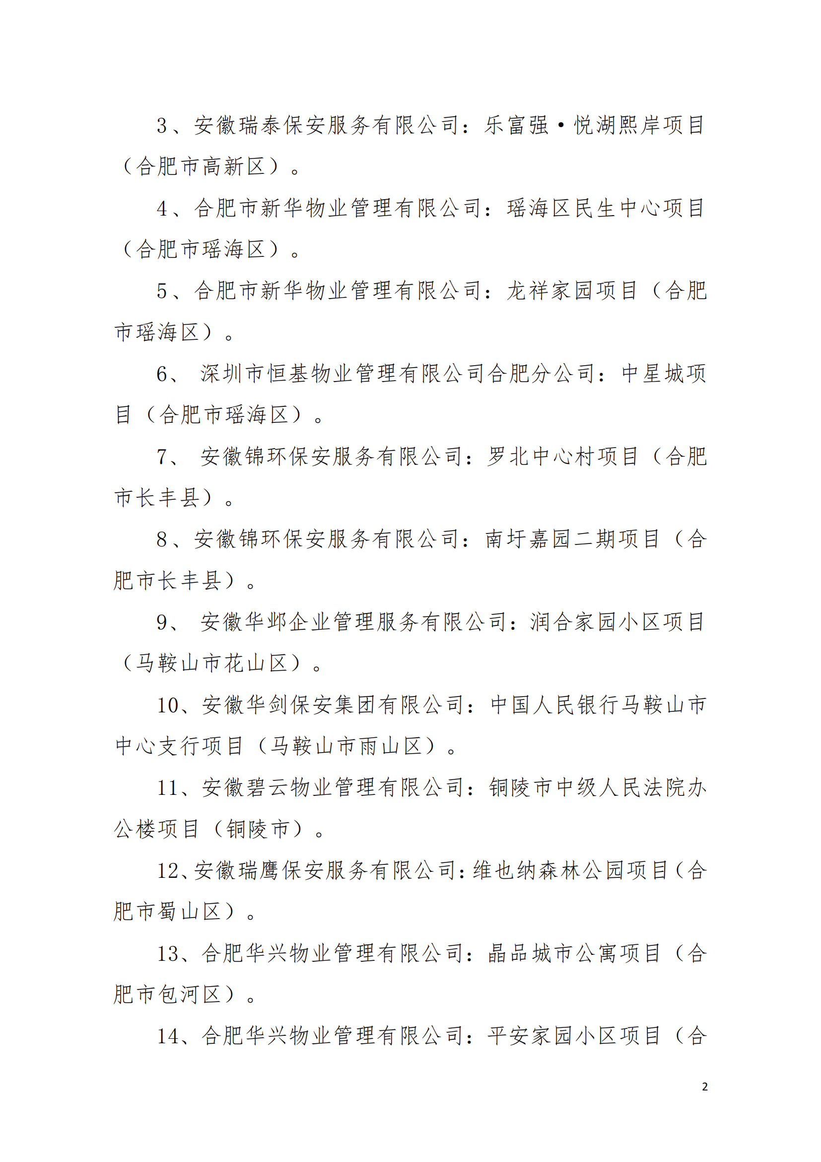 12、安徽瑞鹰保安服务有限公司:维也纳森林公园项目(合肥市蜀山区)。