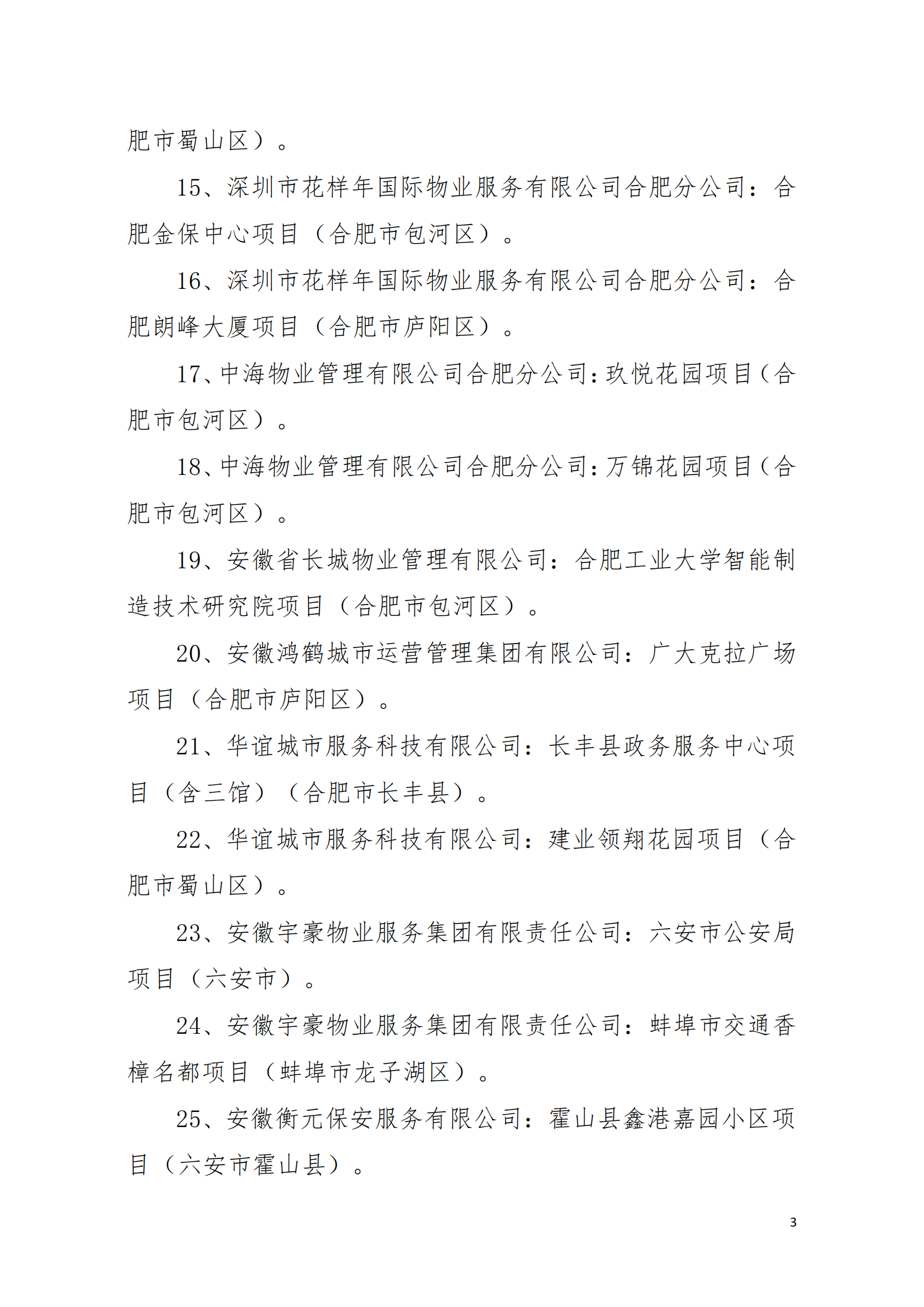 16、深圳市花样年国际物业服务有限公司合肥分公司:合肥朗峰大厦项目(合肥市庐阳区)。